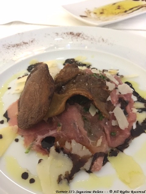 Tagliata di Manzo: Grilled choice Angus ribeye steak sliced and topped with shaves of parmigiano, sea salt, truffle oil and truffle glaze, served on an arugola bed prepared with fine onions and sun-dried tomatoes
