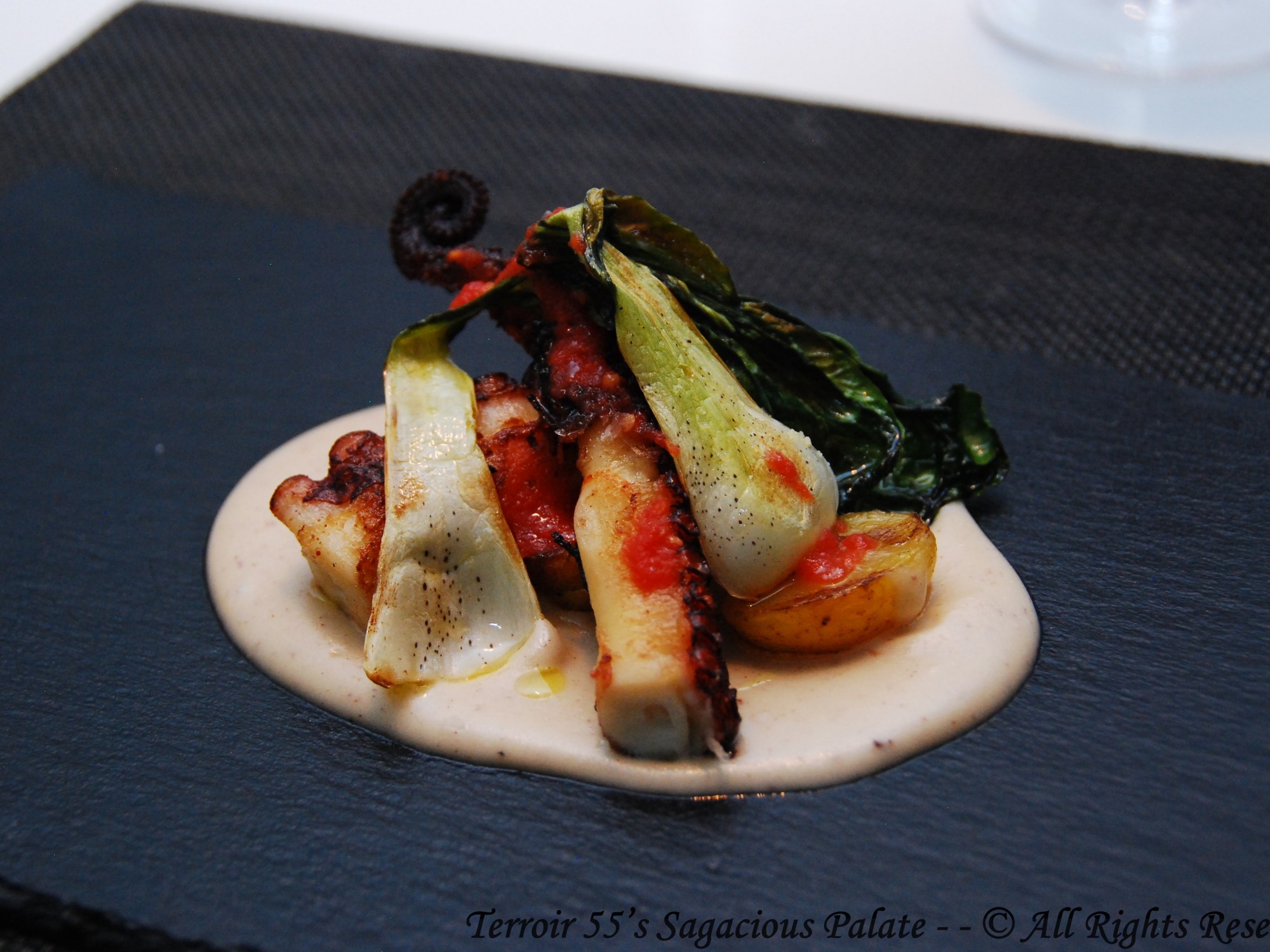 Pulpo A Las Brasa Con Crema De Feta, Tomate Rallado Y Pak Choi