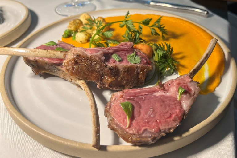 Lamb Chops (Moroccan Mint Tea Infused, Carrot Puree, Crispy Yukon and Green Peas)