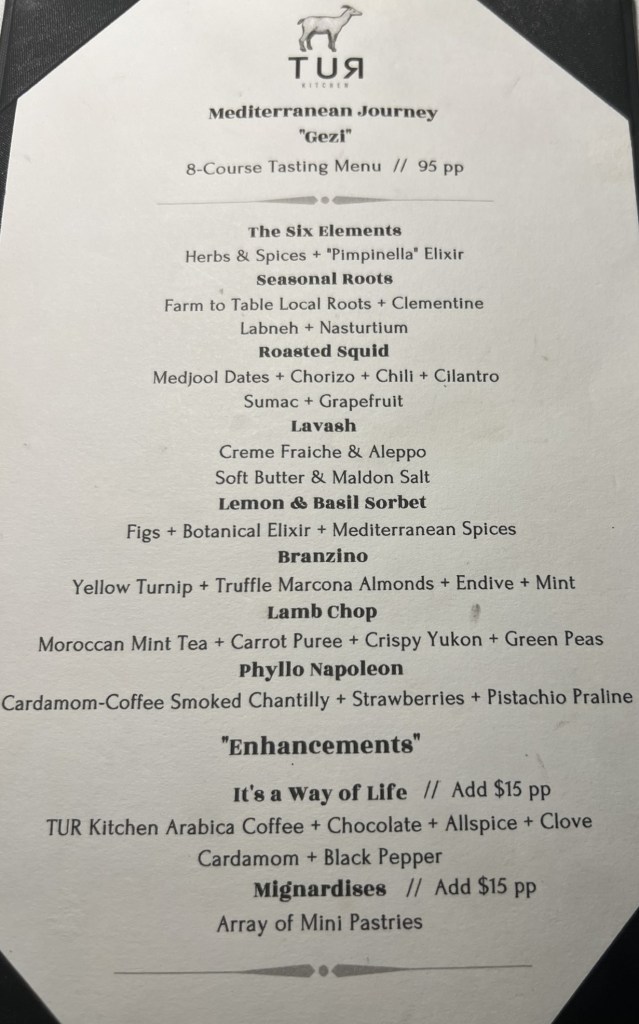 As Tur website states: “TUR Kitchen draws its inspiration from the rich and vibrant Mediterranean basin, which encompasses such diverse destinations and culinary hotbeds as Southern France, Spain, Italy, Greece, Lebanon, Israel, Türkiye, and Northern Africa.