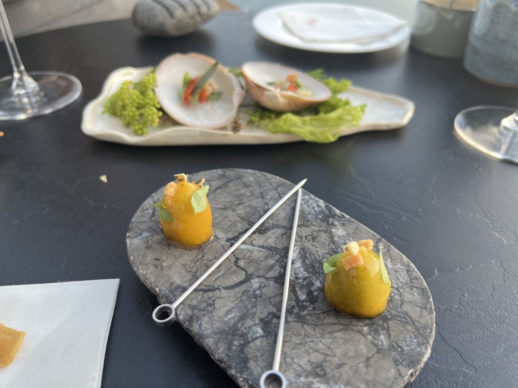 Starting off the evening with a gorgeous sunset and watching several glasses of rosé seamlessly become part of the natural horizon was absolutely breathtaking. Bastien meticulously poured the perfect glass every time and Etienne serving the first of several mind-blowing amuse-bouche, captured the essences of what would be for an evening unlike any other. Who could ask for more? Well….ME – – and that’s exactly what’s happened….MORE!!!!