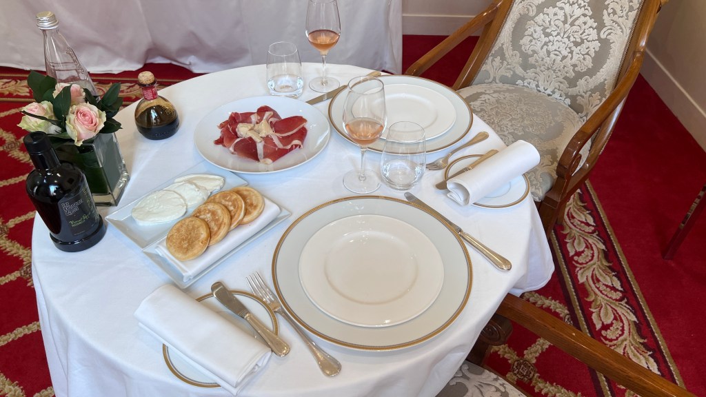 Back at Grand Hotel Majestic – già Baglioni in our private room, we set out to make the traditional pasta of Bologna. But first a little prosciutto and vino!!!!!