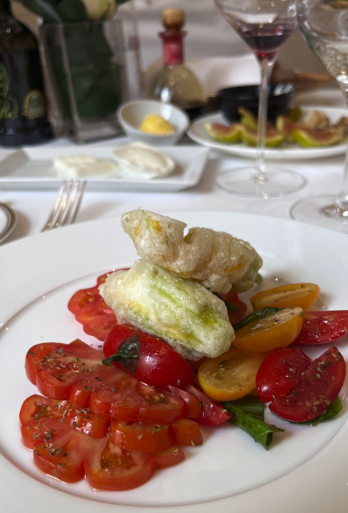 Stuffed Zucchini Blossoms with tomatoes, basil, herbs and a delicious side of sweet figs.