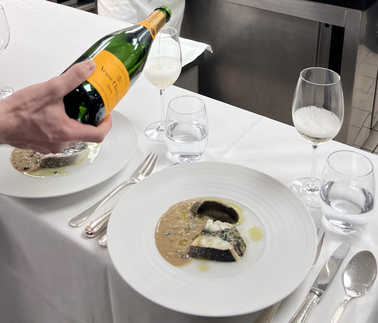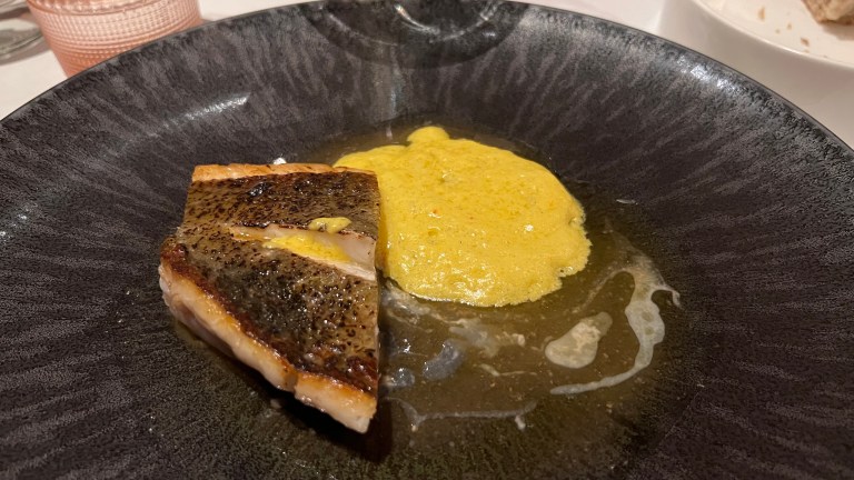 STUFFED SEA BASS, CELERY AND NORI PURÉE, FISH VELOUTÉ, LEMON OIL