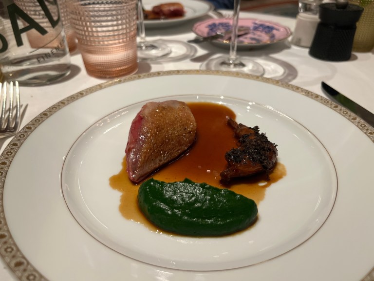 PIGEON COOKED ON A TRUNK, PIGEON JUS, CONFIT LEG, GIBLET BONBONS